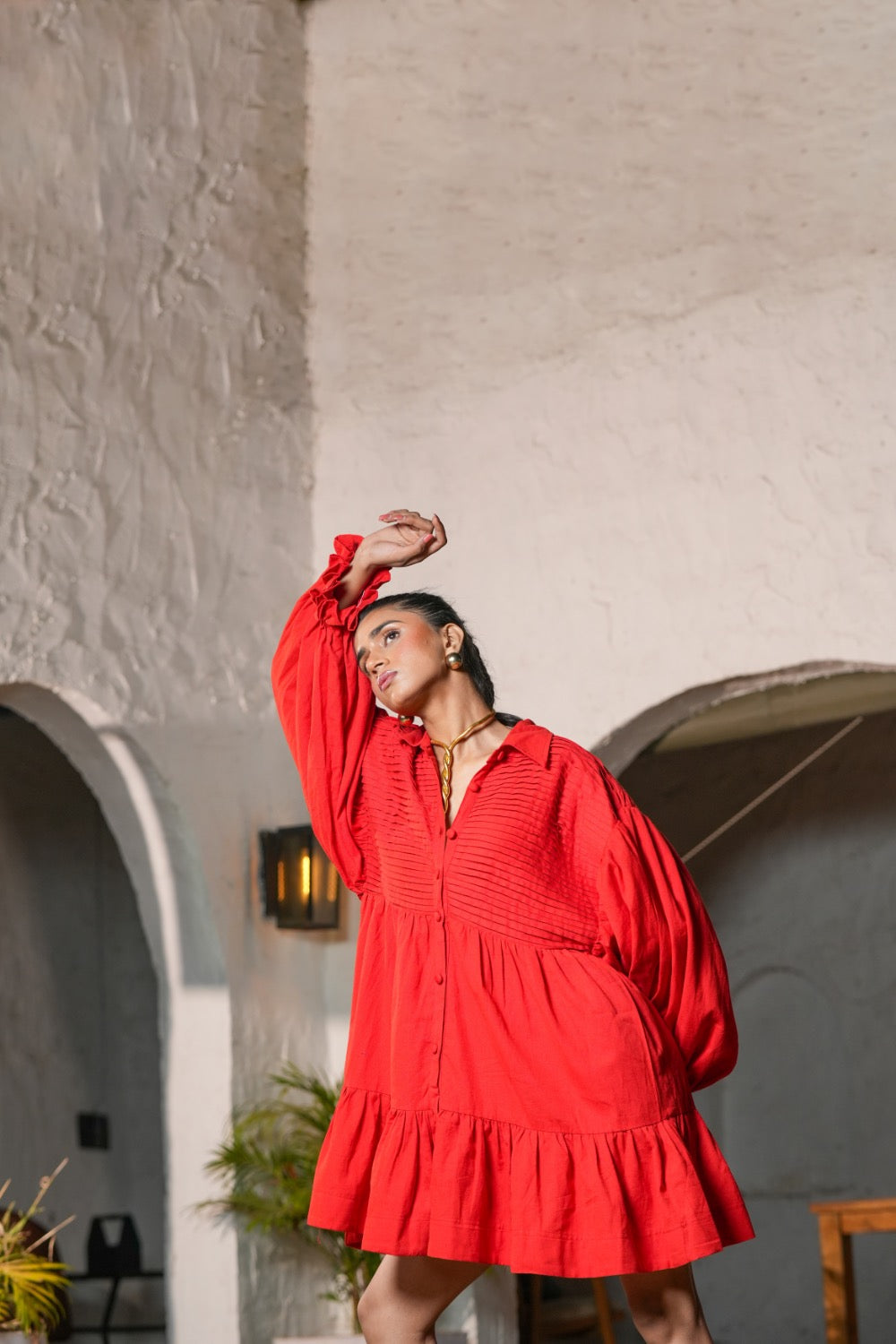 Crafted in breathable cotton flex, this bold red dress blends comfort with statement-making ease. The intricate pintucked yoke adds structure, while the voluminous sleeves and tiered hem create a soft, dramatic silhouette. Perfect for travel days, brunch afternoons, or elevated everyday wear. The button placket detail makes it versatile, holiday-ready statement piece.