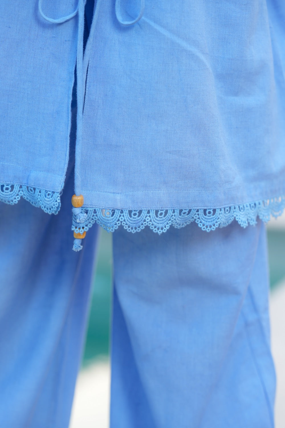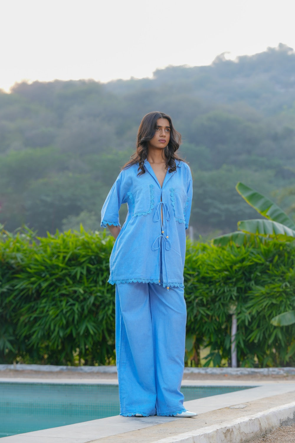 Crafted in a dreamy powder-blue hue, this cord set brings together oversized comfort and timeless elegance. The easy drape shirt with lace-trimmed detailing pairs seamlessly with wide-leg trousers that elongate your frame. Effortless, breathable linen blend, and distinctly chic — the perfect all-day resort look.